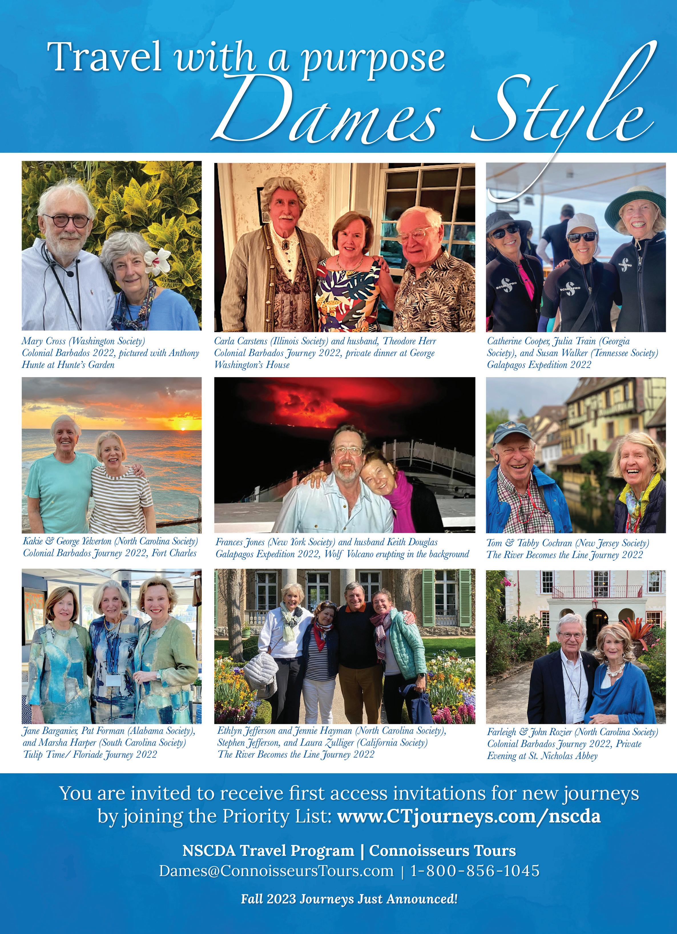 Those who find their way to the NSCDA, whether in person or online, continue to enjoy an organization deeply rooted in flagship historical properties and tradition, as well as innovation, revelation and new initiatives. Our newly introduced membership outreach reflects great credit on those whose appreciation of the Dames and all we represent is exceeded only by their commitment to growing membership, sustaining us as a robust organization.