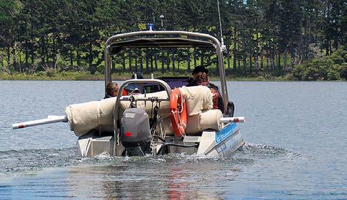 submerged. Here, where the Kaihū River wraps around Dargaville, the one-way gate will help to drain water away at low tide, and keep it out when the tide is high. The mayoral inspection party came during a very high tide to witness a stress-test of the system, which passed easily.