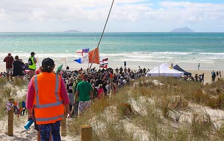 As Highland pipers played and waka gathered offshore among a flotilla of civilian craft, sand mining opponents assembled, answering the call of the Bream Bay Guardians. Represented in the protest were surf lifesavers, local business leaders, boating and fishing clubs and kapa haka groups.