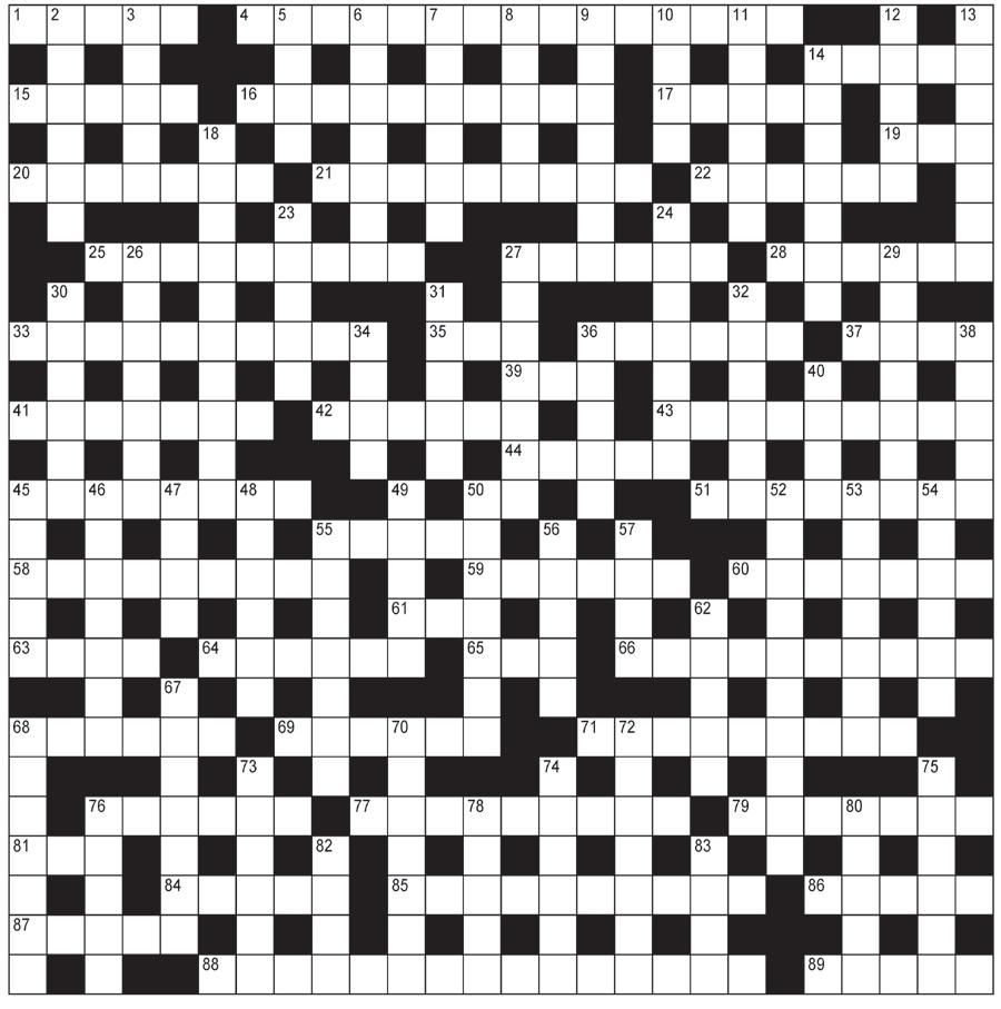 ACROSS: 1 Skyline, 4 Artificial, 9 Perplex, 13 True, 14 Scribe, 15 Rarely, 16 Disobey, 19 Neglectful, 20 Unlawful, 21 Ledge, 24 Lustre, 25 Agenda, 27 Duplicate, 32 Accident, 33 Plague, 34 Hopeful, 38 Curtains, 39 Absurd, 40 Echo, 41 Cease, 42 Lemon, 45 Correspondence, 52 Steep, 55 Admit, 56 Mess, 57 Insult, 58 Sculptor, 61 Cranium, 62 Fracas, 63 Champion, 66 Metronome, 68 Ration, 69 Lessen, 73 Molar, 74 Neurotic, 76 Equestrian, 81 Spoiled, 82 Banana, 83 Trends, 84 Fate, 85 Freedom, 86 Phenomenal, 87 Workers.
