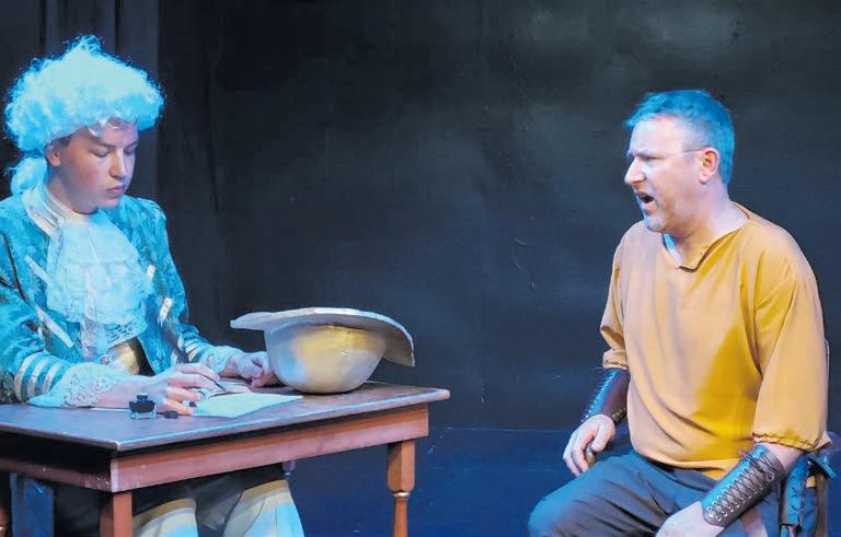 p Rehearsals are heating up, props have been fabricated, lines are memorised, and tickets are on sale for the Dargaville Little Theatre production of Sir Terry Pratchett’s Guards! Guards!, adapted by Stephen Briggs. In this practice scene, scheming bureaucrat Lupine Wonse (Nico Zwaans) argues with world-weary guard captain Sam Vimes (David Cutts). The cast and crew are working hard to tune and time this comedy to perfection, ready for the premiere late in October.