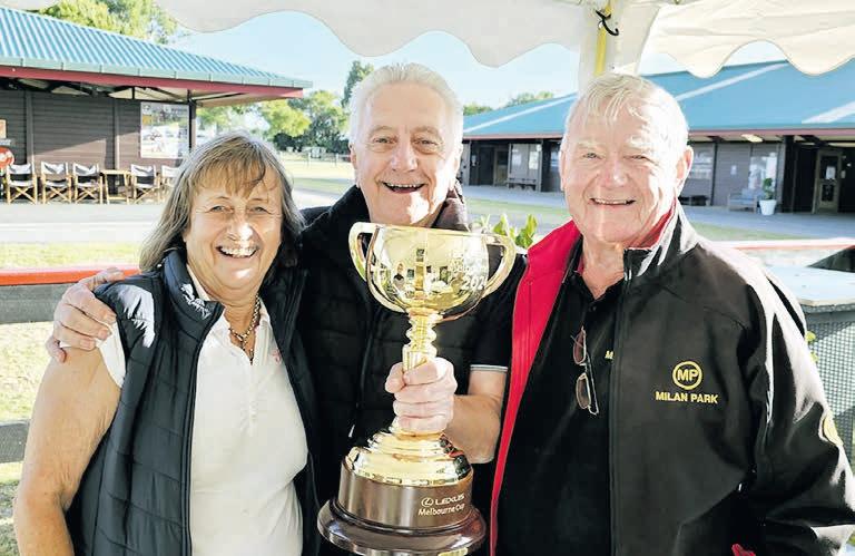 Author Brian de Lore holding the Melbourne Cup, between Sheila Laxon and the late John Jeffs