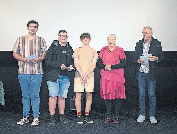 p Last year’s Climate Change Action Film Competition 14–18-year-old winners and people’s choice award winners for the film Collapse Josh Stenbeck, Benjamin Butler, Oli Lasenby and Locky DeMars with Carol Peters and Peter Bruce-Iti