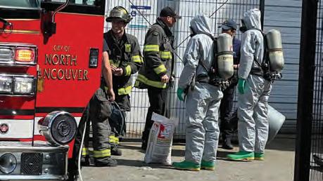 North VancouverCityFire Departmentcrews moppedupamajorspillof hydrochloricacid,Friday. Justbeforenoon,thehazmatcrewwascalledto BCIT’smarinecampuson WestEsplanadewhere a mechanicalleakin thepool maintenance room left upwardsof100litresofthehighlycorrosivechemical on thefloor.