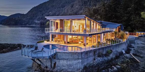 This 5,000 sq. ft. dream homeisone of the most unique properties in West Vancouver. Set at the end of aquiet road, this waterfront peninsula has nearly 400 feet of shoreline that wrapsaround the home and its fortress-like concrete foundation walls! Enjoy the heated oceanside swimming pool and secluded beaches while watching captivatingocean wildlife. The views and sunsets of Howe Sound, the islandsand beyondare magical. This home was built 4years ago, constructed of steel and glass andthe latest technology. Massive walls of windows to maximize the views from every angle. 5bedrooms and 5baths, avery well equipped gym, and about 3,000 sq.ft. oceanside terraces,gardens and lawn.