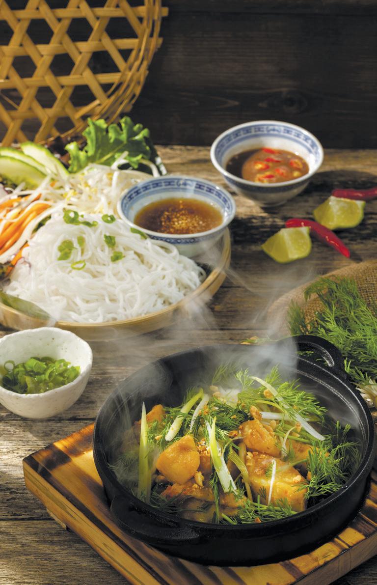 At Phonatic Social, Northern Vietnamese cuisineshines in everydish, especiallythe iconicCha Cá Hà Noi.Rooted in Hanoi’sOld Quarter,this turmeric marinated fish with dill and herbscaptures thetrue heartofNortherncooking To complement thefood, Phonatic Social’s cocktail menu offers athoughtfulexpression of Vietnamese inspiration. Many of our drinks areinspired by Vietnamese ingredientssuch as pandan and ginger, and our most talked-about signatureis thePho Cocktail —featuring Canadian ryewhiskeyfatwashed with 27-hourbeef fat, phodry spices,and abotanical infusionwith Copperpenny gin.