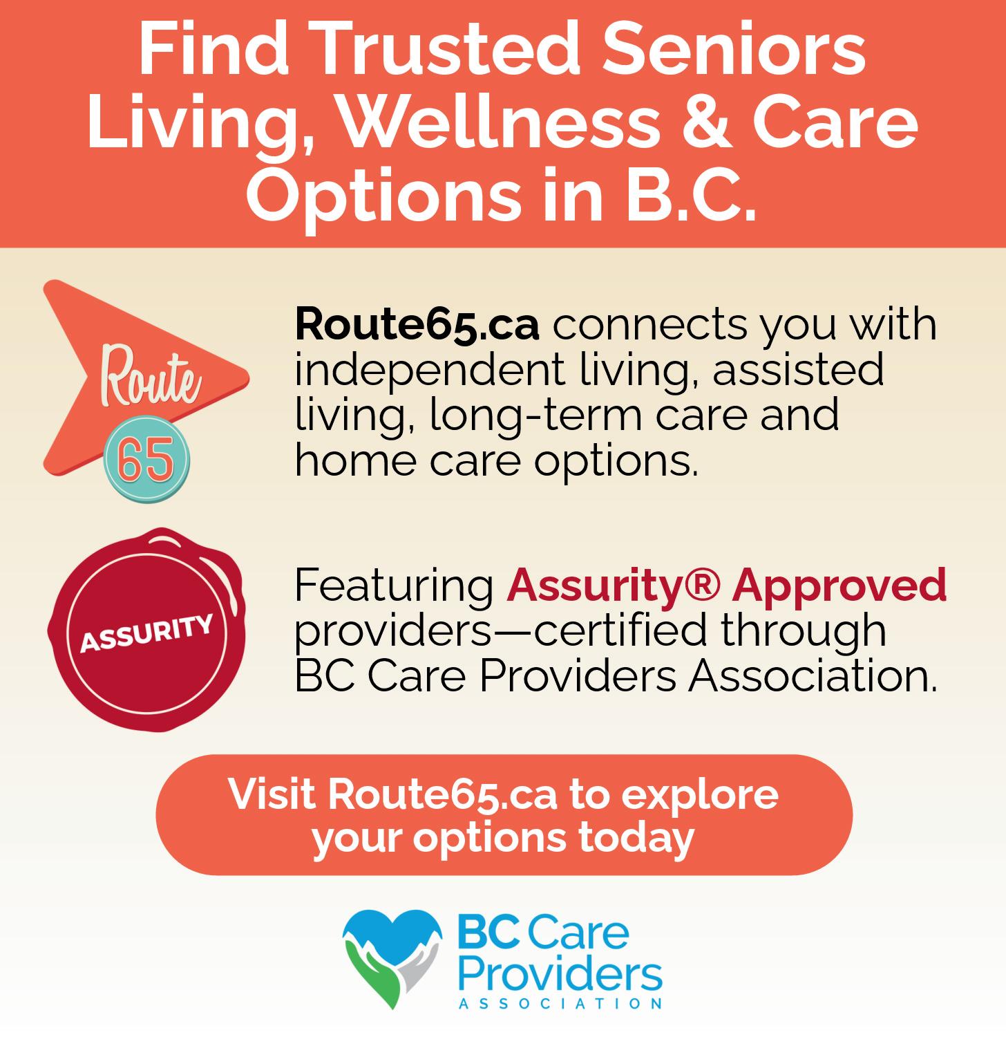 Navigating B.C.’s seniorsliving, wellness, and care options canbe time-consuming and confusing—butitdoesn’t have to be Route65.ca is afree, B.C.-based resource createdbyBCCareProviders Association to helpthe public exploreand access seniorslivingand care services with greatereaseand confidence. TheRoute65.ca platformfeaturesa provincial directoryofB.C.’sleading independentliving, assisted living, longterm care,and homecareoptions.Users cansearch by location, servicetype, or specificneeds,and connect directly with providersacrossthe continuum of care