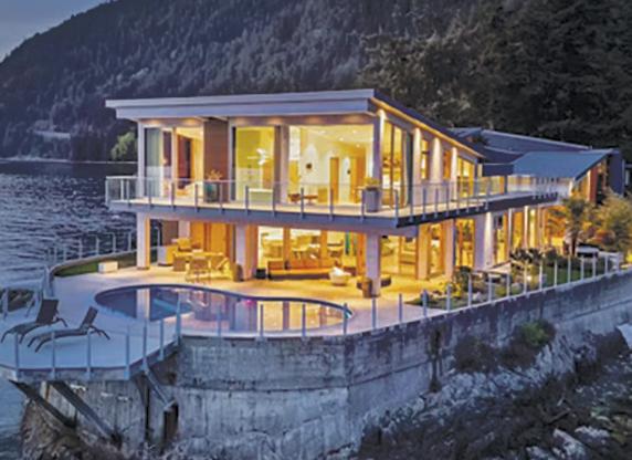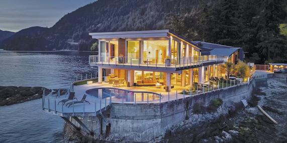 15 Brunswick Beach Rd,Lions Bay This 5,000 sq ft dream home is one of the most uniqueproperties in West Vancouver.Set at the end of aquiet road, this waterfront peninsula has nearly 400 feet of shoreline that wrapsaround the homeand its fortress-like concretefoundation walls!Enjoy the heated oceanside swimming pool and secluded beaches while watching captivating ocean wildlife. The views and sunsets of Howe Sound,the islands and beyond aremagical. This homewas built 4years ago, constructed of steel and glass and the latest technology. Massive walls of windows to maximize the views from every angle. 5bedrooms and 5baths, avery well equipped gym, and about 3,000 sq. ft. oceanside terraces, gardens and lawn.