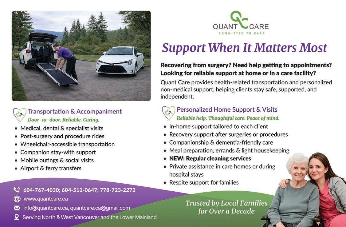 West Vancouver Seniors’ Activity Centre, 604-925-7280 16, 53, 58, 65 Women’s Support Line, 604-987-3374 10, 46 WorkBC Centre North Shore, 604-988-3766 16