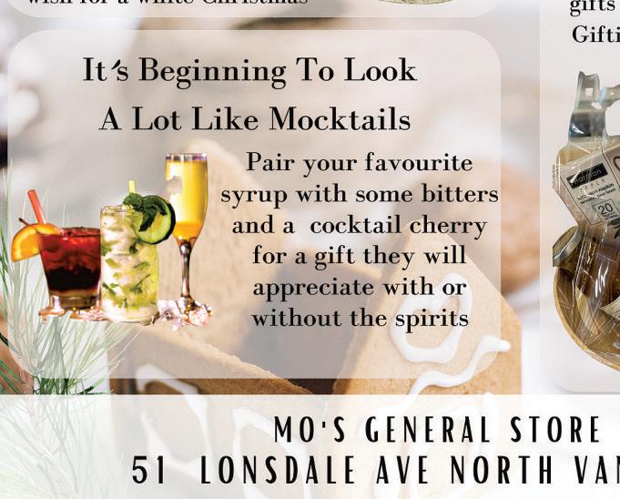 ArtisanalHoneySampler Savouravarietyofartisanalhoneysfrom Fireweed,the“ChampagneofHoneys” tolocalRawUrbanhoneys $16.99 MAINSTREETHONEYSHOPPE 180 125VictoryShipWay NorthVancouver 6049882872 mainstreethoney.com TheQuaygiftcard Can’tdecideonagiftorneedtheperfect stockingstocker?OurQuaygiftcards arethebestpresentever!Availableat FavouriteGiftsorattheHolidayAlley LONSDALEQUAYMARKET 123CarrieCatesCt NorthVancouver lonsdalequay.com FOR pets stockingstuffers forthehard-to-shop-for northshorenews nsnewscom B10 | WEDNESDAY DECEMBER 7 2022 A N O N Y M O U S ART S H OW BUYARTONLINE atnorthvanarts.ca @northvanarts #AnonymousArtShow Come back to the joy of live concerts, as the voices of the VWMC, directed by Jonathan Quick, with pianist Karen Lee-Morlang, present a concert of Christmas favourites sacred and secular, traditional and popular, including a taste of Welsh. We will be joined by a combined choir from Argyle Secondary School, and we are pleased to introduce our bursary student, soprano soloist Julia Yoo. Centennial Theatre 2300 Lonsdale Avenue, North Vancouver Friday, December 16th , 7:30pm The Vancouver Welsh Men’s Choir, “Holly Jolly Christmas” Adult/senior $30, child/youth $20 More information and tickets online at www.vancouverchoir.ca, or Centennial box office 604-984-4484. vancouverchoir.ca #105 3246 Connaught Crescent, North Vancouver 604.929.5772 | EdgemontNaturopathic.com Christmas Gift Givingmade easy GIFT CERTIFICATES AVAILABLE FOR THAT SPECIAL SOMEONE THAT IS HARD TO SHOP FOR! Eminence Skin Care Products Holistic Skincare Naturopathic Services Acupuncture Vitamin IV Therapy Food Allergy and Hormone Testing