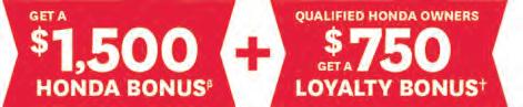LoyaltyHondaBonuswillbe appliedonlyto aHondabrandvehicleleasedorfinancedthroughHFS,on approvedcredit,asfollows:$750bonusonCR-Vmodels. ß“HondaBonus”of$3,000onselectin-stock2025Pilotmodels availableoncashpurchaseorstandard-rateleaseorfinancetransactionsonly,fromHCFIon approvedcredit,andisdeductedfromthenegotiatedselling priceaftertaxes.Not applicabletopromotionalorsubventedleaseorfinancerates.†LoyaltyHondaBonusis availabletoeligiblecustomerswho:(i)arethecurrent owner/lesseeof aHondaorAcuravehicleandresideinBC,AB,SK,MBorON;and(ii)have acurrentHonda FinancialServices(HFS)/Acura FinancialServices(AFS)leaseorfinanceaccount,or apreviousHFS/AFSaccount thatexpiredwithinthepastyear(365days).Thisofferisnottransferabletoanyotherperson.ProofofeligibilityisrequiredandmustbesubmittedtoHFStoqualifyforthisloyaltyoffer.LoyaltyHondaBonuswillbe appliedonlyto aHondabrandvehicleleasedorfinancedthroughHFS,on approvedcredit,asfollows:$1,000bonusonPilotmodels.LoyaltyHondaBonus:(i)will apply onlytocurrentpaymentsadvertisedbyHFSinCanada;(ii)cannotbecombinedwithotherexistingloyaltyoffers,unlessotherwiseindicated.OfferendsSeptember2nd,2024andissubjecttochangeorcancellationwithoutnotice.Dealermaysell/leaseforless.Offer availableonly at participatingHondadealersin WesternCanada.Dealerorderortrademaybenecessary. Models may notbeequippedasshownandareforillustrationpurposesonly.VisitHonda.caoryourHondadealerfordetails. THEVERSATILE2025