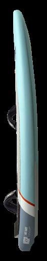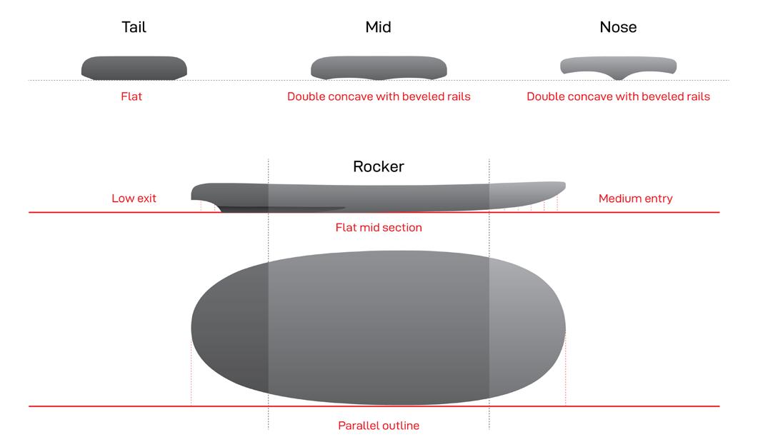 • Flat rocker through the middle and tail with relief from the tail cutaway to kick the tail early to get onto foil.