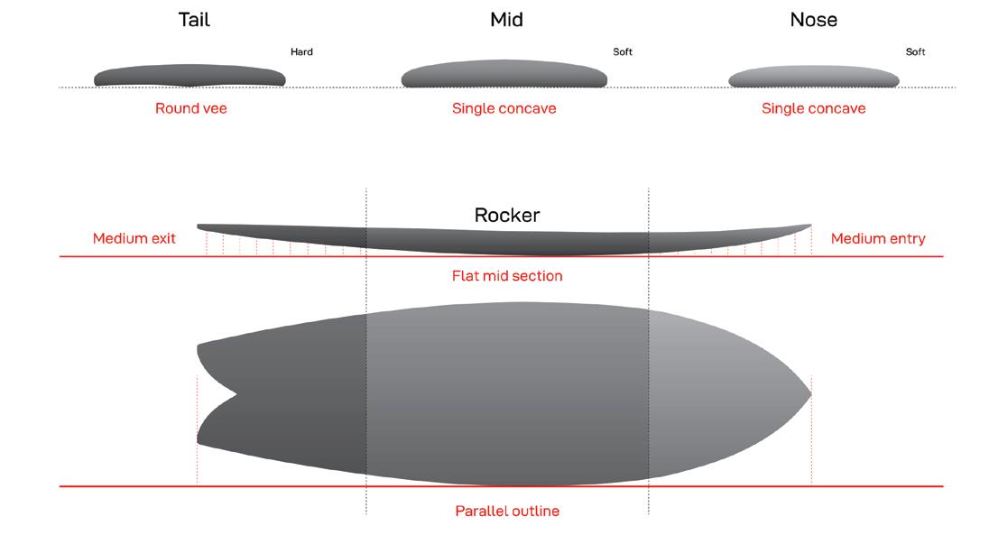 Beautiful outlines combined with relaxed nose rockers, classic roll to V with double concaves in the tail combine to give you that “easy in” with loads of rail-to-rail performance.