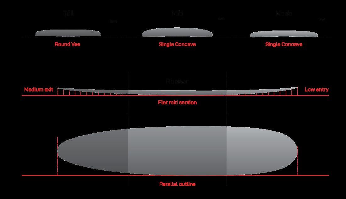 • Medium rocker line so the board doesn’t nose dive and allows for great maneuverability
