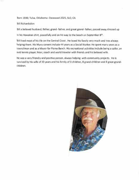 helping them. His many careers include 44 years as a Social Worker. He spent many years as a councilman and as a Mayor for Pismo Beach. His recreational activities included being a sailor, an avid tennis player, hiker, coach, and world traveler with friends and his beloved wife.