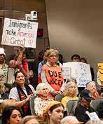 DUBIOUS DEBATE Many attendees of the TRUTH Act forum on Jan. 27 scoffed, and some held up signs in protest as Sheriff Ian Parkinson laid out the nature of his office’s interaction with ICE agents.
