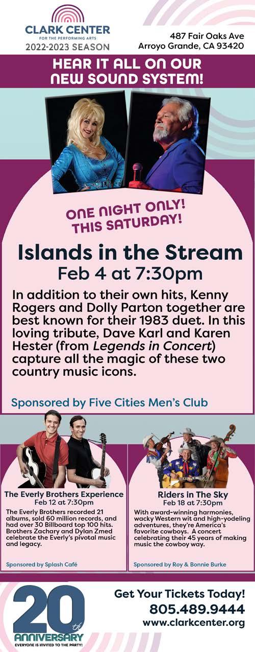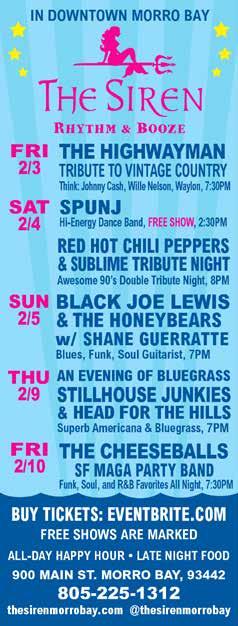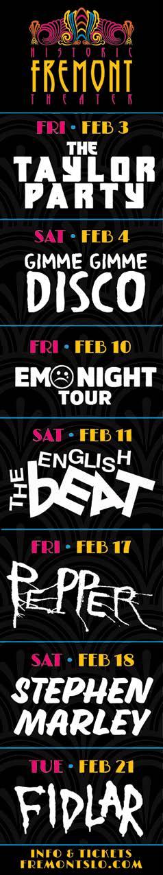 CONTACT US FOR A DEMO TODAY! 805-546-8208 or info@My805Tix.com TICKET WITH US! • FREE local ticketing service • FREE marketing promotion from New Times and Sun • Local customer service • Support local journalism & POWERED BY: My805Tix.com BOUTIQUE 1391 W. Grand Ave., Grover Beach 805-329-2464 • PerrisBoutique.com Come visit or shop online OPEN Wed-Fri 10am-5pm · Sat 10am-2pm Sun-Tues Closed EUROPEAN STYLE in Grover Beach for Men & Women Fashion • Hats • Bags • Accessories • Jewelry locally owned and operated M–F: 8am–5:30pm S: 8am–3pm SUN: Closed (805) 541-8473 252 HIGUERA STREET SAN LUIS OBISPO (Lower Higuera Next to Hayward Lumber) THANK YOU FOR YOUR SUPPORT! • Tires • Wheels • Brakes • Shocks • Alignment PRICES ARE BORN HERE... RAISED ELSEWHERE BEST TIRE STORE Not valid with other promotions, subject to availability, not available on holidays. Does not apply to groups. Must mention this coupon when making reservations and present at check-in. Does not include tax. Valid 1/1/20233/30/2023. Sunday-Thursday nights. Add $50 for Friday nights. No Saturdays. 800-966-6490 • 805-927-4200 • 2905 Burton Dr., Cambria, CA 93428 Includes two dinner entrées & a bottle of house wine plus breakfast! Package only bookable by phone at 800-966-6490 ESCAPE COUPON PACKAGE PLAN YOUR WINTER GETAWAY! Special Code WIPRIN Rooms from $199 Suites from $249 www.newtimesslo.com • February 2 - February 9, 2023 • New Times • 3