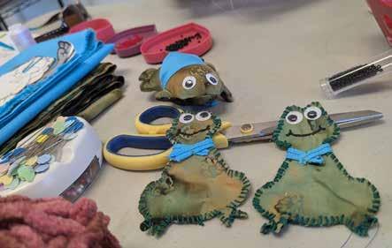 WATCHFUL, GOOGLY EYES: Vicky McClain created frogs with blue kerchiefs to represent peaceful resistance inspired by protesters in Portland, Oregon, during Immigration and Customs Enforcement activity. McClain helped others make frogs at Indivisible Lompoc’s March 8 craftivism event.