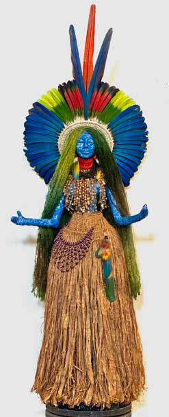 SCULPTED AND DRESSED: Materials in Earth Flower ’s headdress and skirt are from an art market in an indigenous village in northeastern Brazil. The piece is on display at Paulo Lima’s exhibit, Dreams and Revelations, at the Foxworthy Gallery.