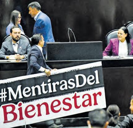 La panista Elizabeth Martínez, con pancartas de “Mentiras del Bienestar”, “Se ocultan las cifras reales”, “Bienestar sin niñez ni adolescencia”, entre otras, criticó que “no es cierto que México sea uno de los países con menor desigualdad. Los datos duros lo confirman, 62.7 millones de personas siguen sin seguridad social, 44.5 millones sin acceso a servicios de salud, 24.2 millones con rezago educativo y el gasto de bolsillo en salud aumentó 42 % entre 2018 y 2024”.