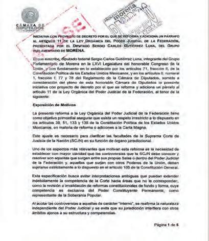 l grupo parlamentario de Movimiento Regeneración Nacional (Morena) en la Cámara de Diputados presentó una iniciativa de reforma para ‘sellar’ el veto a la Suprema Corte para ir contra las reformas constituc ionales aprobadas por el Congreso. Dice que está clara en la Constitución su incompetencia, pero argumenta que “debe quedar plasmado en la ley que ocho ministros no pueden suprimir la voluntad del pueblo” EL FINANCIERO F12