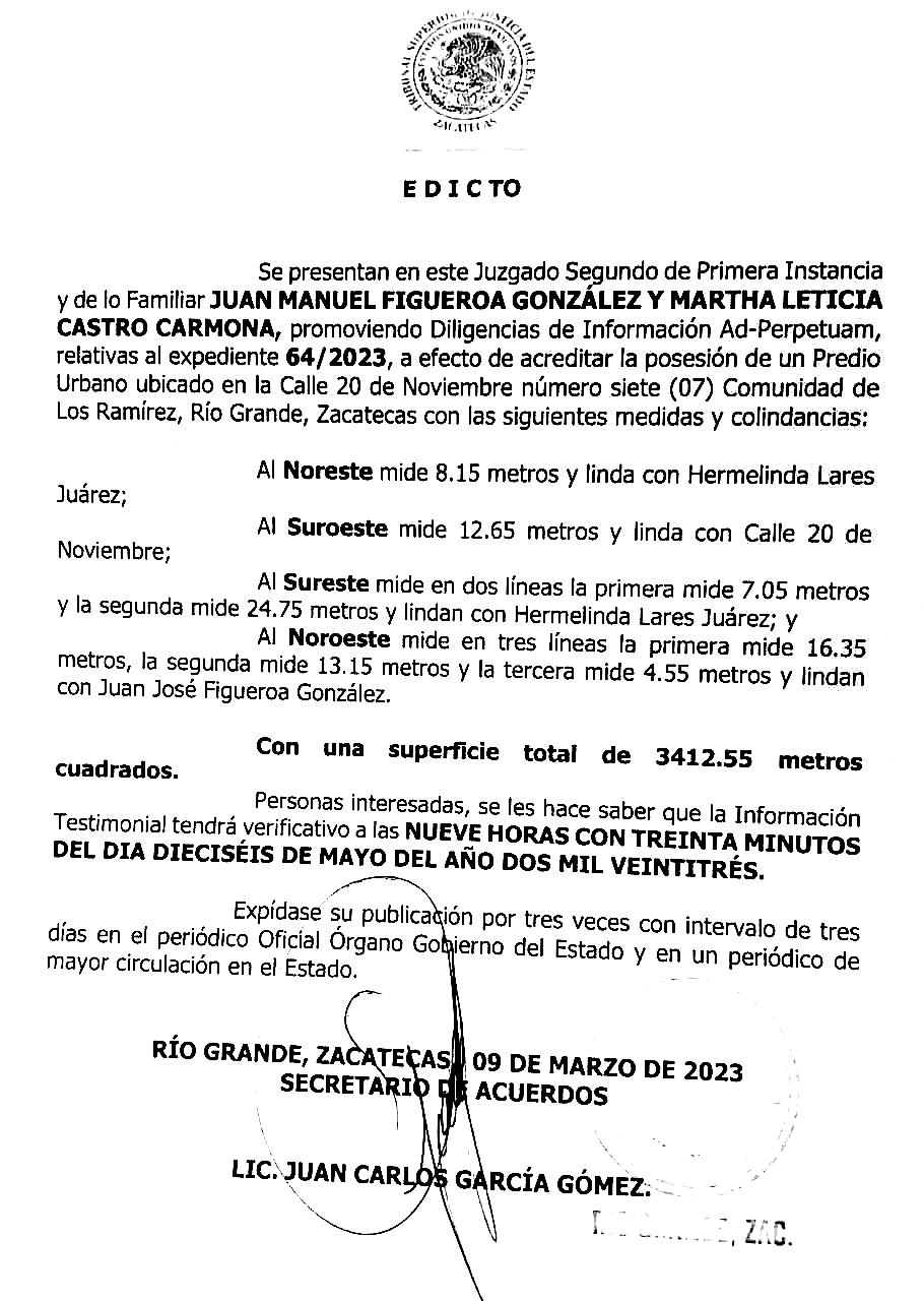 Se vende rancho las nubes sobre autopista Jerez-Tepetongo. Frente de 360 Mts., agostadero, luz eléctrica, pozo, dos bordos con agua todo el año, obra negra para casa, capilla, caballeri zas, lienzo charro, corra les, arrancaderos, áreas de estacionamiento, etc. Sup. 171-08-71.62 Hect.