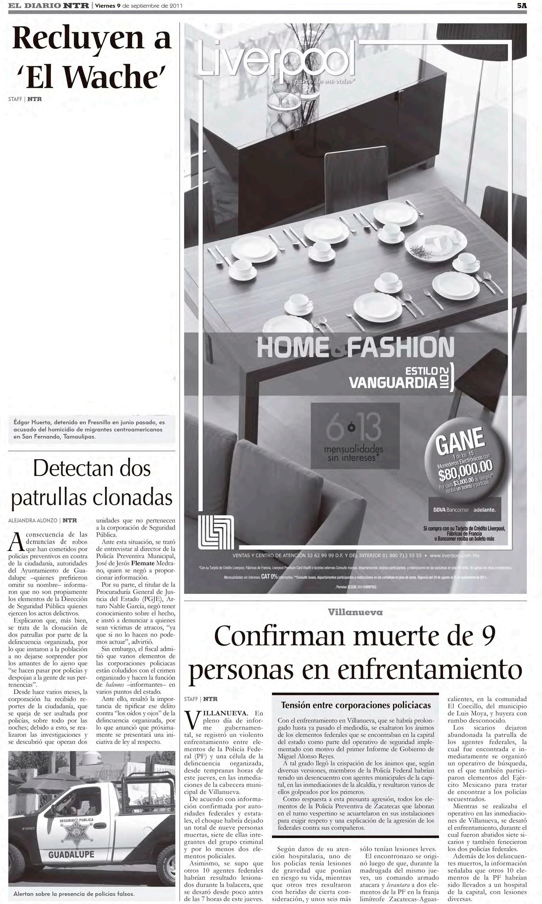 VILLANUEVA. En pleno día de informe gubernamental, elementos de la Policía Federal (PF) chocaron contra miembros de la delincuencia organizada, lo que derivó en la muerte de nueve personas. Dos de las víctimas eran agentes federales y las siete restantes eran sicarios. Además, se confirmó que por lo menos 10 personas fueron hospitalizadas luego de la refriega. Los violentos hechos comenzaron durante la madrugada de este jueves, cuando un comando armado atacó y secuestró a dos policías federales en