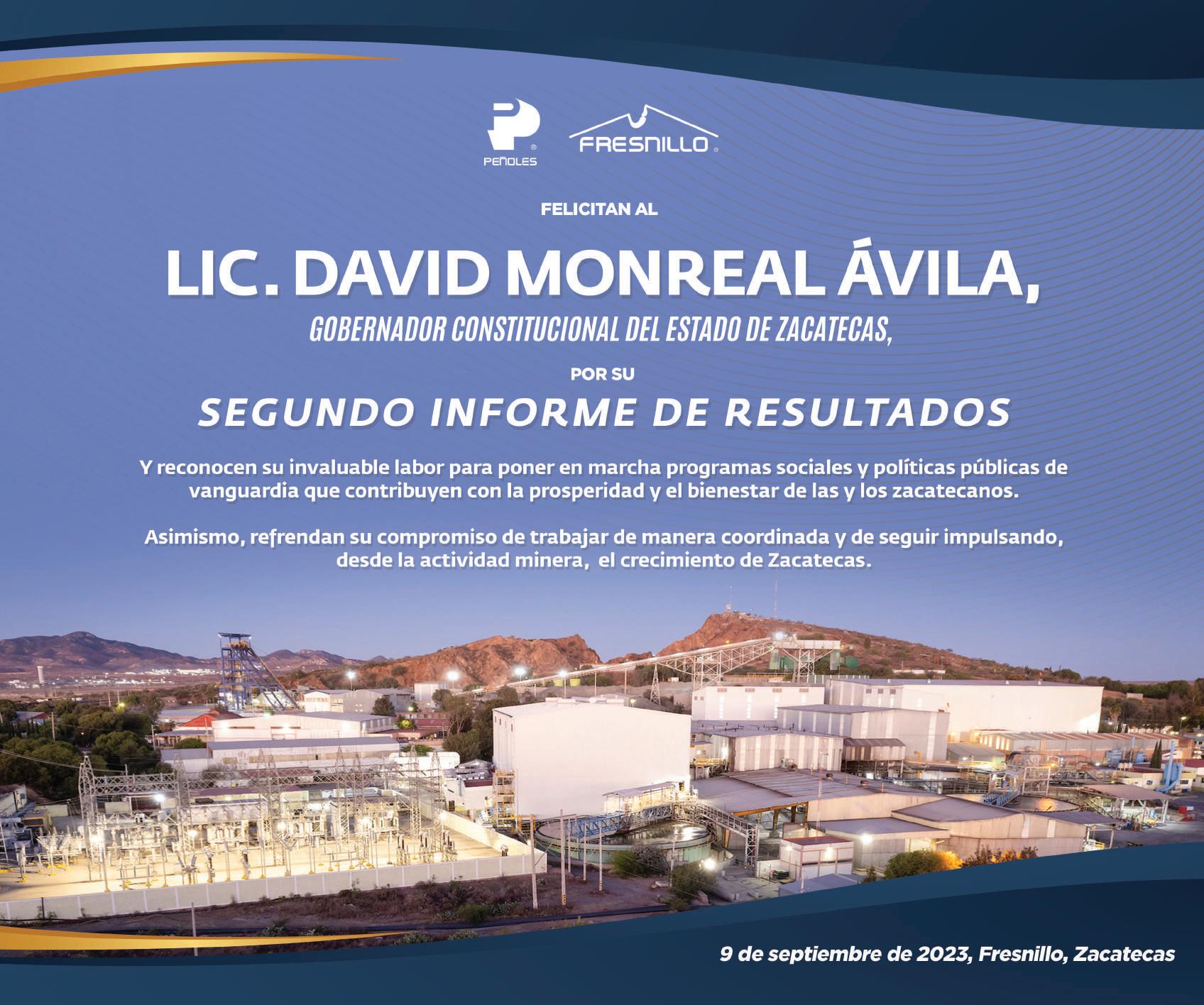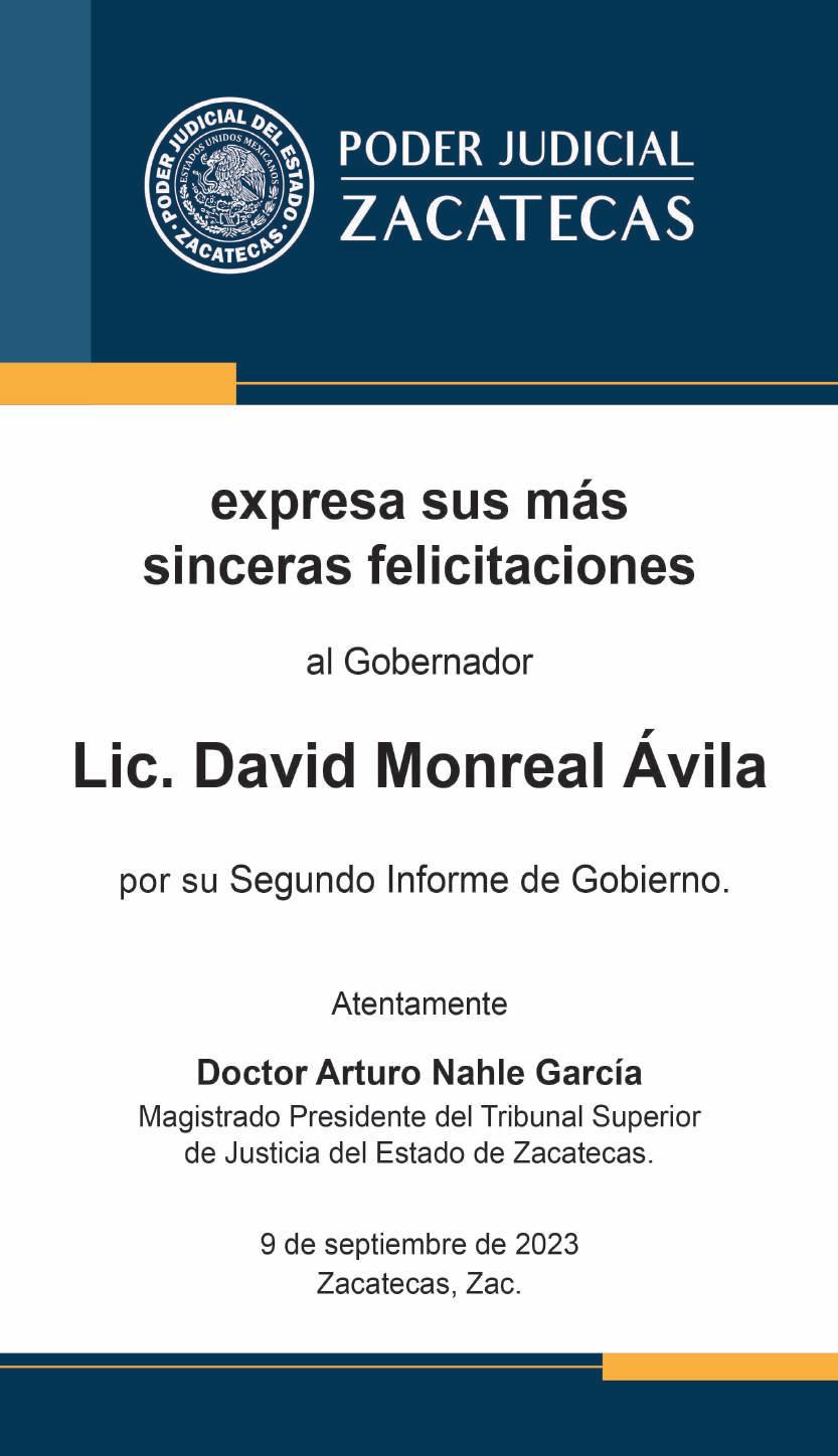 En su mensaje con motivo del segundo Informe de Gobierno, el mandatario David Monreal Ávila destacó las primeras 100 acciones de su administración en los 58 municipios y el apoyo del presidente Andrés Manuel López Obrador para lograrlas.