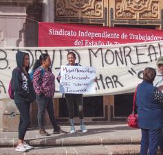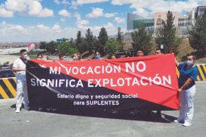 ● PREVIO AL segundo Informe del gobernador David Monreal Ávila, un grupo de trabajadores suplentes de Enfermería del Hospital General Zacatecas (HGZ) se manifestó cerca del helipuerto, para exigir aumento salarial y mejoras laborales. Resaltaron que llevan años con sueldos menores al mínimo y sin certeza jurídica. DAVID CASTAÑEDA