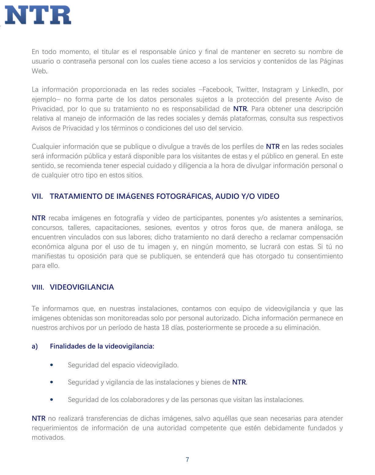 Los datos personales que los usuarios llegaren a proporcionar a través de estos portales o sitios de internet no se encuentran contemplados en este Aviso de Privacidad y su tratamiento no es responsabilidad de NTR, ya que se sujetarán a los respectivosAvisos de Privacidad publicados encada uno de esos sitios.