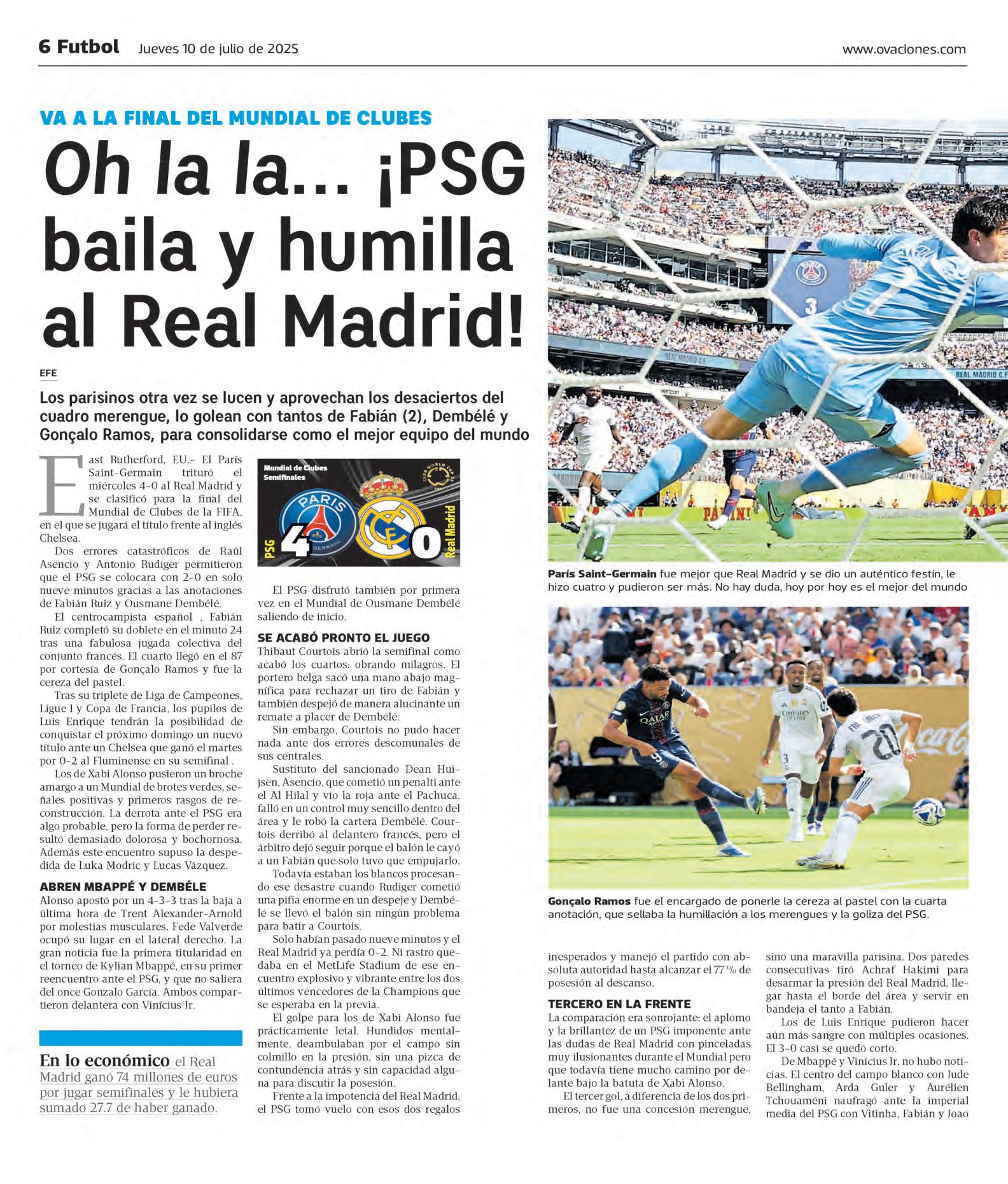 En un partido que estaba resuelto apenas a los 25 minutos, el cuadro parisino aplastó 4 a 0 a los merengues y avanzó a la final del Mundial de Clubes, donde lo espera el Chelsea. O VACIONES O6 Y O7
