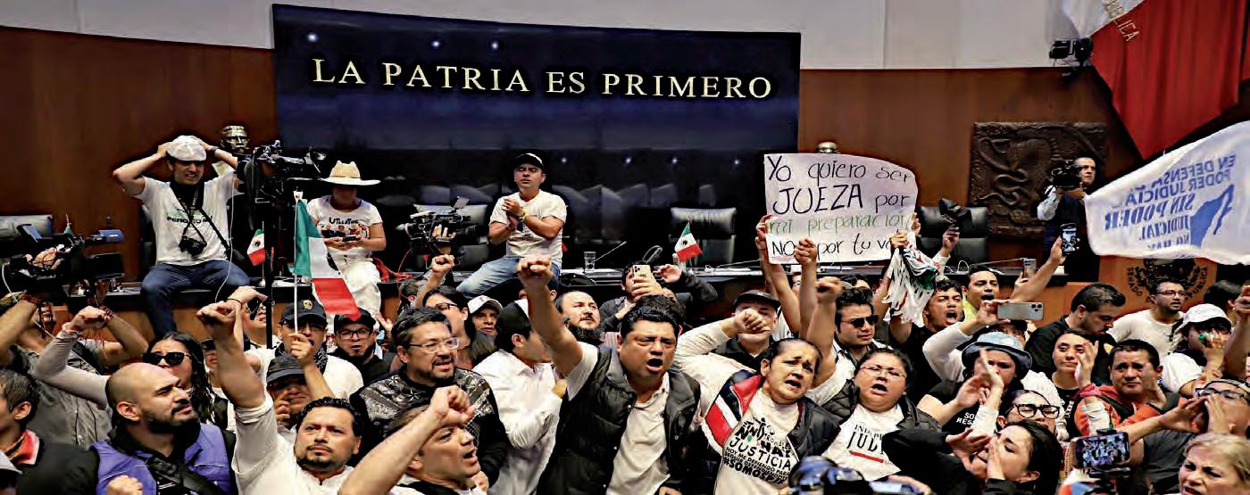 “No va a caer, no va a caer, el Poder Judicial no va a caer”, retumban los altavoces en el pleno, donde panistas, priístas y emecistas permanecieron para escuchar las demandas de los manifestantes, mientras los morenistas, verdes, petistas y “traidores” huyeron, con la mayoría calificada asegurada para aprobar la reforma al Poder Ju-