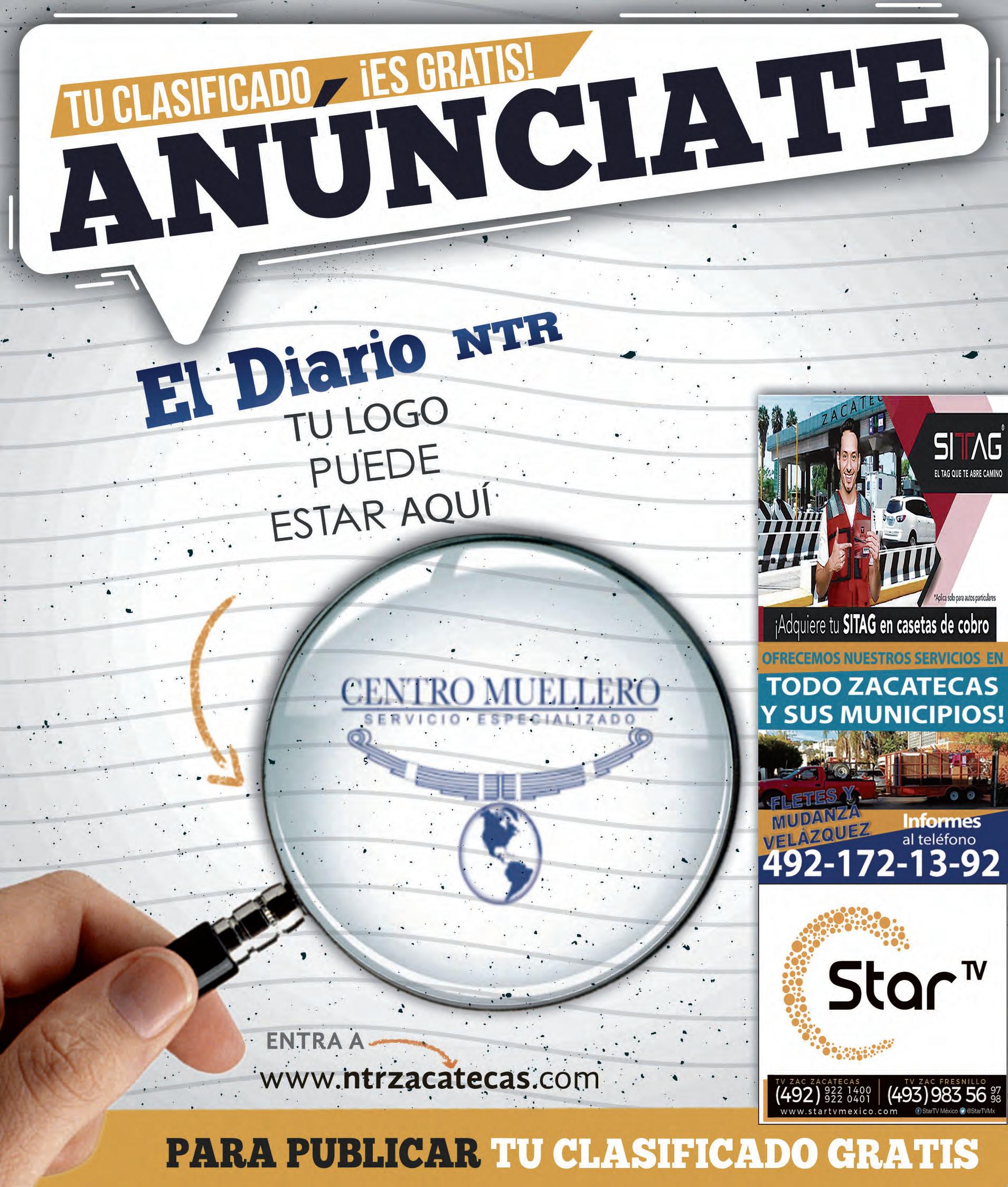 Sábado 13 de mayo de 2023 Zacatecas, Zac. Año XV Número 5164 $15.00 CONCEPCIÓN DEL ORO 101.3 FM / FRESNILLO 94.3 FM / PINOS 102.5 FM / RÍO GRANDE 98.7 FM / SOMBRERETE 92.3 FM / TLALTENANGO 90.1 FM www.ntrzacatecas twitter.com/ntrzacatecas facebook.com/ntrzacatecas ESCANEA el código QR y entra a ASESINAN A BALAZOS A UN HOMBRE EN OJOCALIENTE ALERTA 8-A