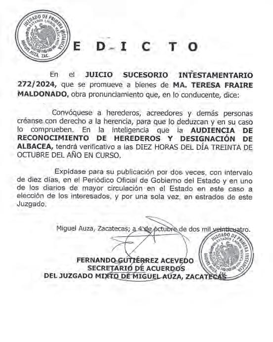 ● TERMINADA la insaculación realizada este sábado en el Senado de la República, de las 464 magistraturas y los 386 juzgados que se elegirán el próximo año, cinco y seis, respectivamente, corresponden a Zacatecas. En cuanto a las magistraturas, se trata del primer y segundo tribunales colegiados, así como el de apelación del vigésimo tercer circuito, de las cuales cuatro están vacantes. Además, son plazas de jueces y juezas del distrito especializado en el Sistema Penal Acusatorio del Centro de Justicia Penal Federal, el primer Tribunal Laboral Federal de Asuntos Individuales, los juzgados primero y tercero de Distrito, segundo y cuarto de Distrito del Centro Auxiliar de la Novena Región. Trabajadores del Poder Judicial de la Federación reprocharon que “se sacrificará la carrera judicial”.