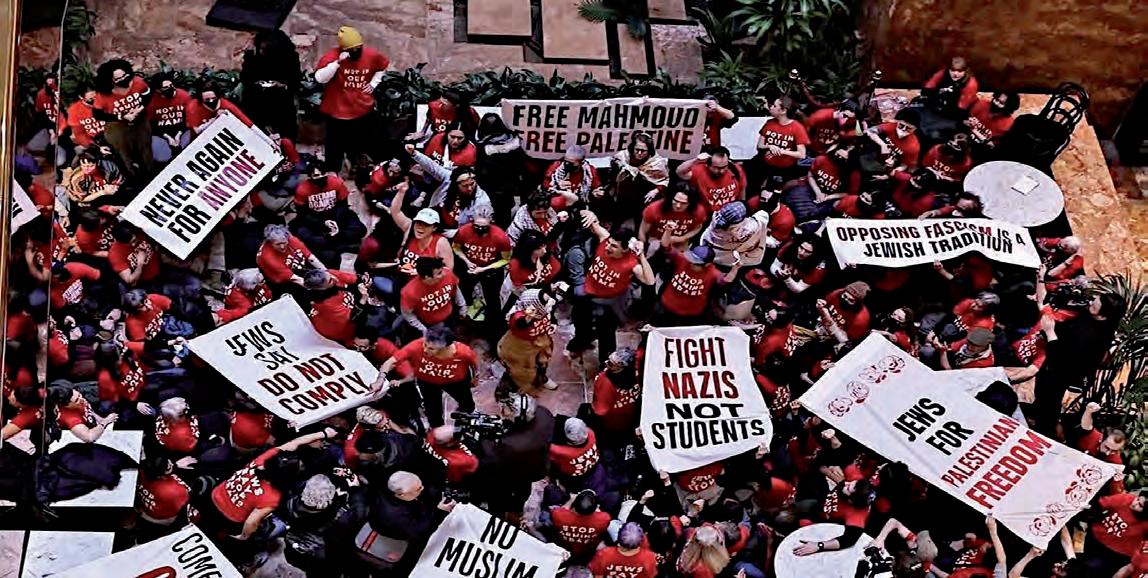 Voz Judía por la Paz irrumpieron en la Torre Trump en rechazo al arresto del ex estudiante de Columbia Mahmoud Khalil.