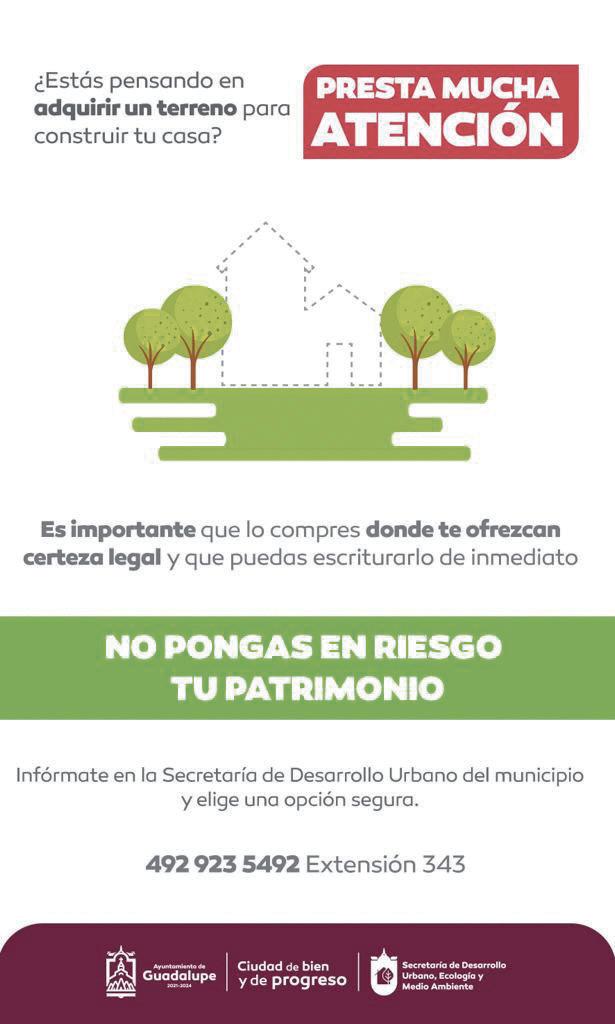7. Inf. Bienes Raíces Guillermo Sigg tel. 492 9220146 y 492 9226672.