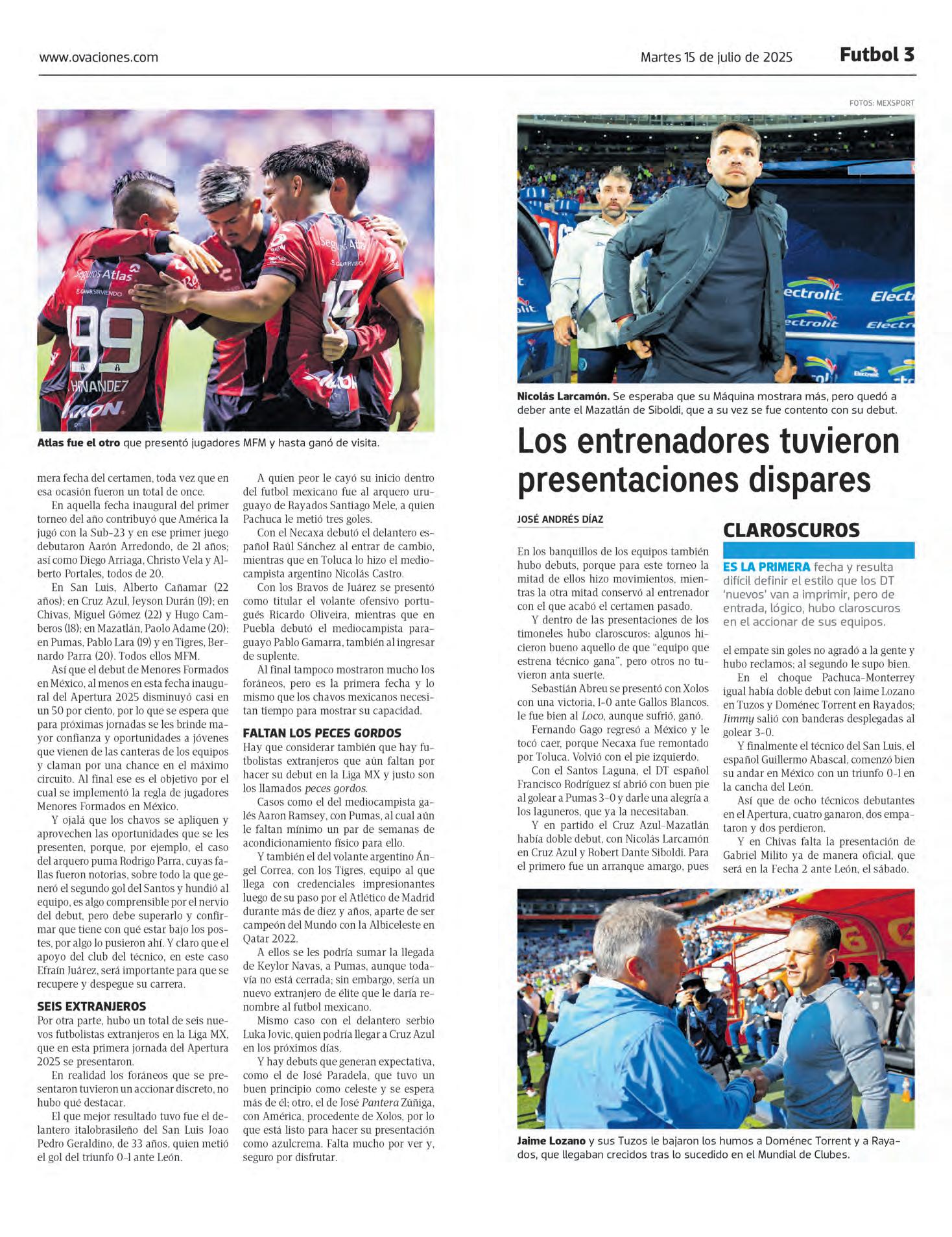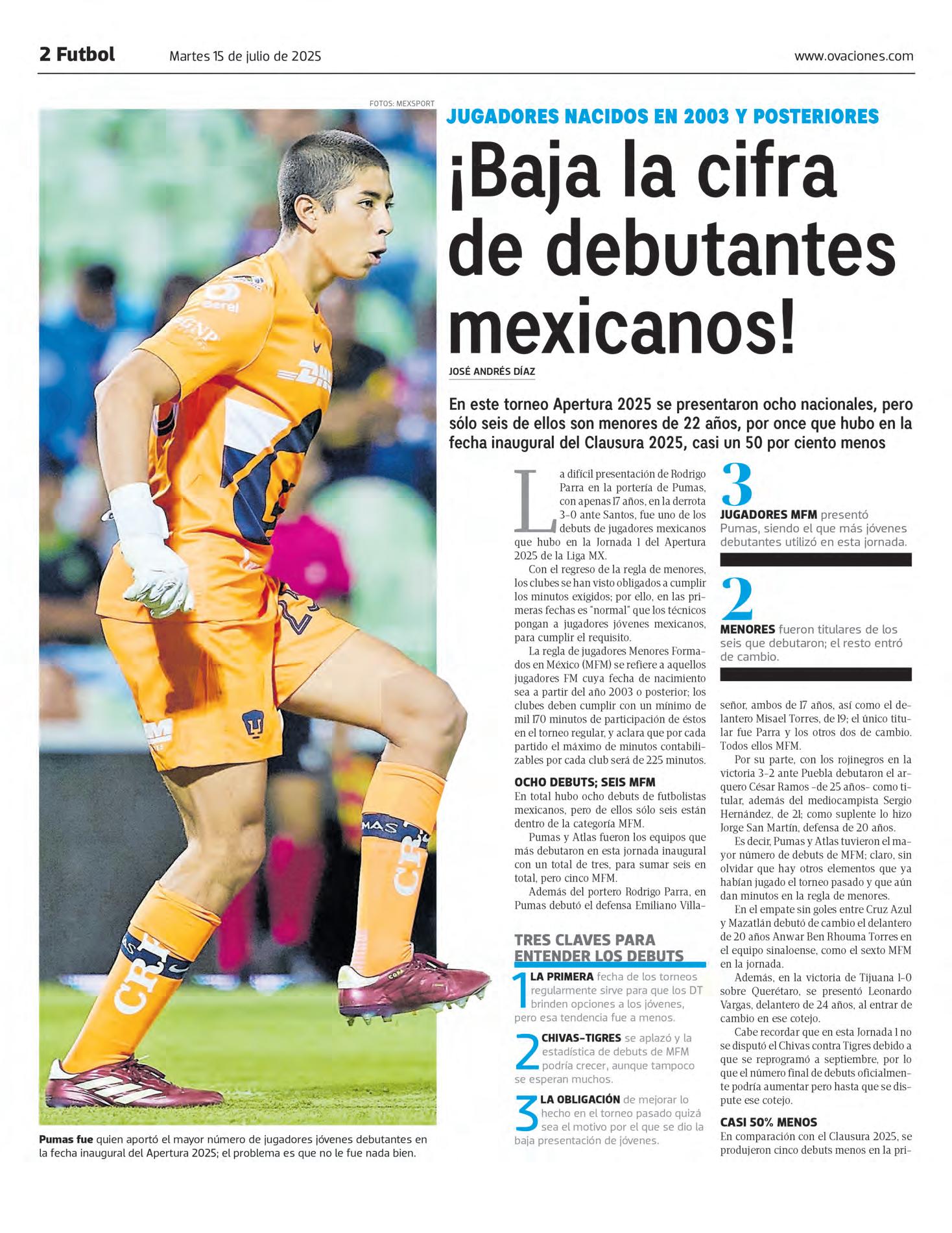 ● EN ESTE torneo Apertura 2025 se presentaron ocho jugadores nacionales, pero solo seis son menores de 22 años, por 11 que hubo en la fecha inaugural del Clausura 2025, casi un 50 por ciento menos. JOSÉ ANDRÉS DÍAZ OVACIONES O2 Y O3