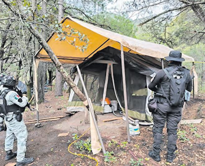 ● GENARO CODINA. Elementos de la Guardia Nacional (GN), del Ejército Mexicano y la Policía Estatal Preventiva (PEP) localizaron un campamento conformado por 10 carpas con cocina, 11 casas de campaña e indicios de un centro de monitoreo. Había un almacén de víveres, baños, dormitorios, sistema de