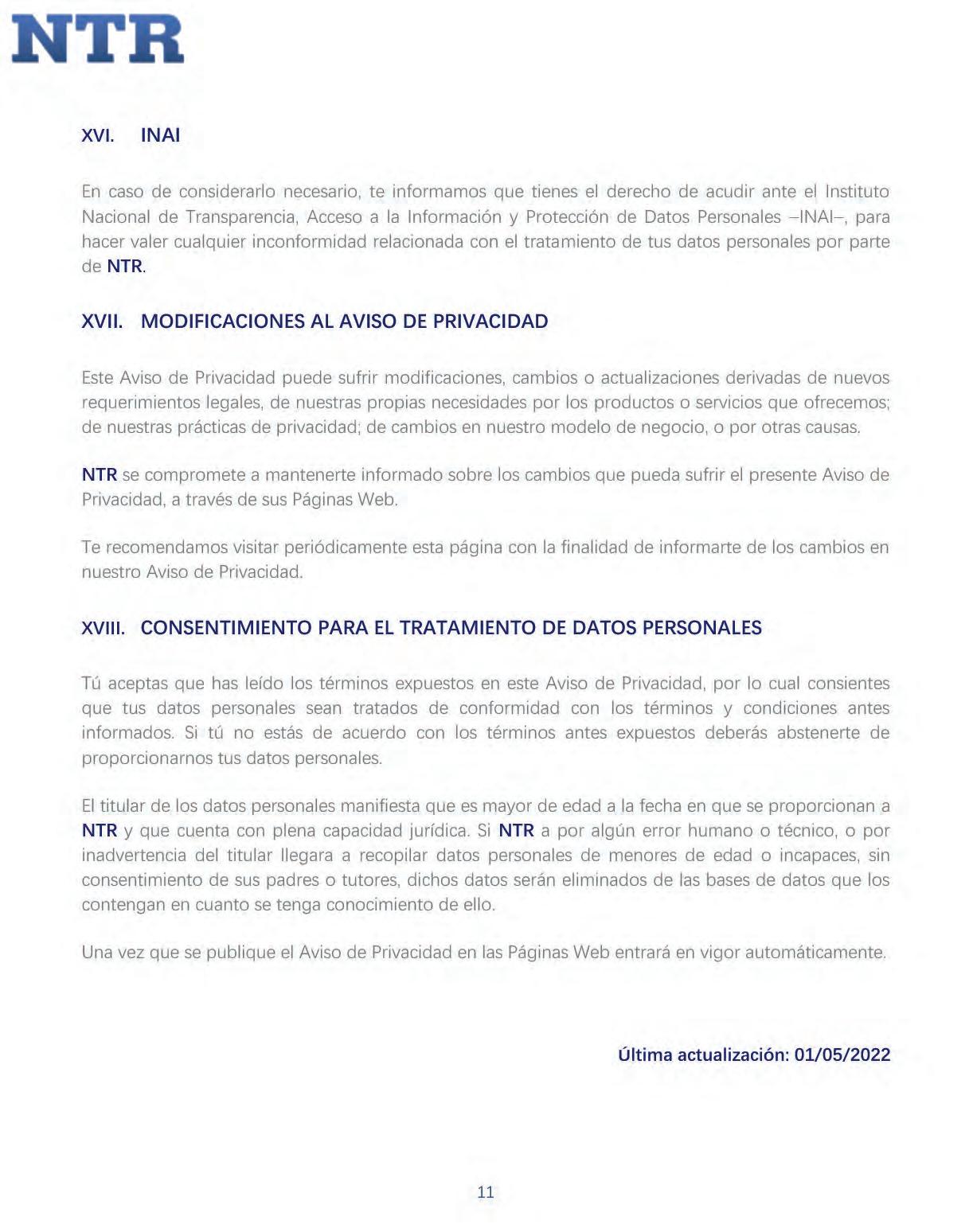 Los datos personales que los usuarios llegaren a proporcionar a través de estos portales o sitios de internet no se encuentran contemplados en este Aviso de Privacidad y su tratamiento no es responsabilidad de NTR, ya que se sujetarán a los respectivosAvisos de Privacidad publicados encada uno de esos sitios.