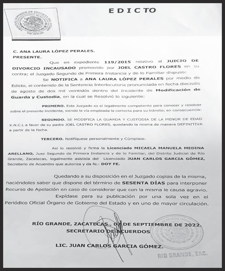 Además, en Zacatecas sólo existe una sentencia por desapa rición forzada cometida por par ticulares, referente a hechos ocu rridos en 2021. Se trata del caso de Perla Brillet, por el que Raúl de Jesús fue sentenciado a 56 años y tres meses de prisión.