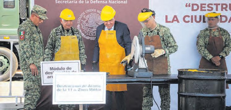 ● PERSONAL DEL Ejército Mexicano destruyó 114 armas de fuego, así como 51 mil 498 cartuchos y 721 cargadores de diversos calibres. Este armamento, decomisado a integrantes de la delincuencia organizada, fue deshabilitado este martes en una ceremonia que se llevó a cabo en las instalaciones de la undécima Zona Militar. Al respecto, el gobernador David Monreal Ávila celebró una disminución con respecto a la última edición, cuando se recibieron 265 armas. Esto, lo consideró como un éxito motivado por las estrategias de seguridad implementadas. ÁNGEL LARA / METRÓPOLI A3
