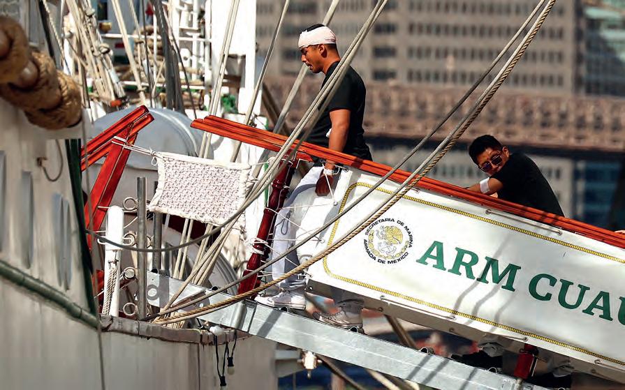●UN EQUIPO integrado por la Junta Nacional de Seguridad en el Transporte (NTSB), la Guardia Costera, las autoridades portuarias de Nueva York y el gobierno de México, colaboran en la investigación de la colisión del buque escuela Cuauhtémoc de México contra el icónico puente de Brooklyn, ocurrido la víspera y que dejó un saldo de al menos dos marineros mexicanos muertos y al menos 19 heridos, 11 de ellos graves. JOSÉ LÓPEZ ZAMORANO EL FINANCIERO F12 ENRIQUE QUINTANA