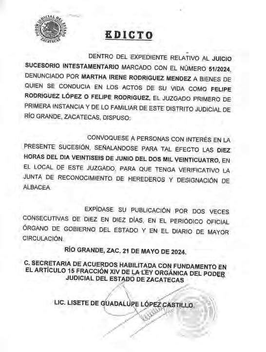 Domingo 3 de diciembre de 2023 Zacatecas, Zac. Año XVI Número 5366 $15.00 FRESNILLO 94.3 FM RÍO GRANDE 98.7 FM / SOMBRERETE 92.3 FM / TLALTENANGO 90.1 FM Y 1100 AM / CONCEPCIÓN DEL ORO 101.3 FM / PINOS 102.5 FM www.ntrzacatecas.com Miércoles 19 de junio de 2024 5557 ESCANEA EL QR PARA VER LA VERSIÓN DIGITAL