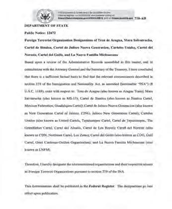 Como lo prometió horas después de llegar a la Casa Blanca, Donald Trump dio luz verde al Departamento de Estado para designar como grupos terroristas foráneos a seis cárteles del narcotráfico de México. Se trata de los cárteles de Sinaloa, Jalisco Nueva Generación, Unidos, del Noreste, del Golfo y La Familia Michoacana. El documento publicado en el Registro Federal entra en vigor hoy. EL FINANCIERO F12