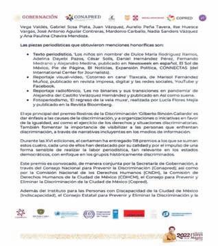 del 1 de julio del año en curso”, mientras que una tercera está “relacionada con su deceso el pasado viernes en un centro hospitalario”. Al tratar de contactar a la titular de la Secretaría General del Gobierno, Gabriela Pinedo Morales, fue imposible localizarla. Por otra parte, Javier Reyes Romo, subsecretario de Concertación Política, excusó que por una salida de emergencia a municipios le era im-