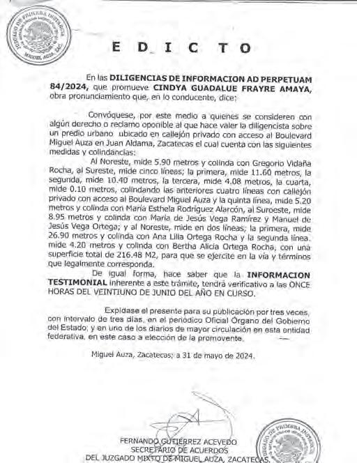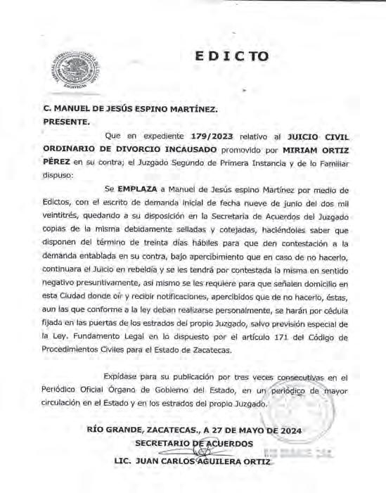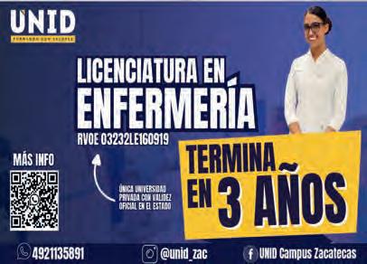 Viernes 21 de junio de 2024 Zacatecas, Zac. Año XVI Número 5559 $15.00 FRESNILLO 94.3 FM RÍO GRANDE 98.7 FM / SOMBRERETE 92.3 FM / TLALTENANGO 90.1 FM Y 1100 AM / CONCEPCIÓN DEL ORO 101.3 FM / PINOS 102.5 FM www.ntrzacatecas.com JEREZ ■ Entregan primeras actas de nacimiento en braille A8 CULTURA ■ Inicia Festival del Corrido Don Antonio Aguilar A12 SUELDOS ■ Justifica IZC falta de aumento salarial a sinfónica A5 CAPITAL ■ Prohibida, venta y distribución de pólvora en Bracho A3 OJOCALIENTE ■ Siguen abusos de mandos a policías municipales A8 ESCANEA EL QR PARA VER LA VERSIÓN DIGITAL SHEINBAUM PRESENTA A SECRETARIOS Y CONSEJERA AUMENTARÍA PIB CON MÁS INCLUSIÓN DE MUJERES BIDEN REPUNTA 5 PUNTOS Y REBASA