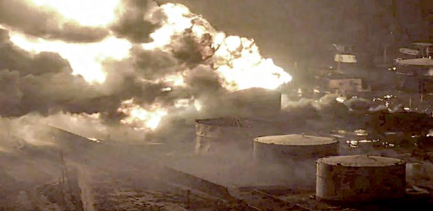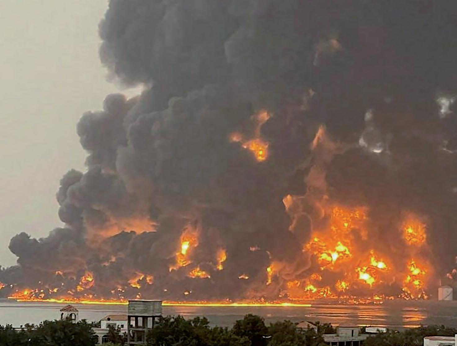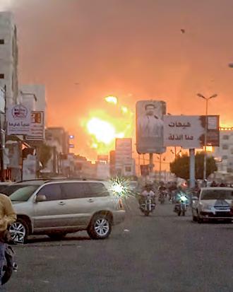 z Una enorme columna de fuego se registró tras un bombardeo israelí en un depósito de petróleo del puerto de Hodeidah, Yemen.