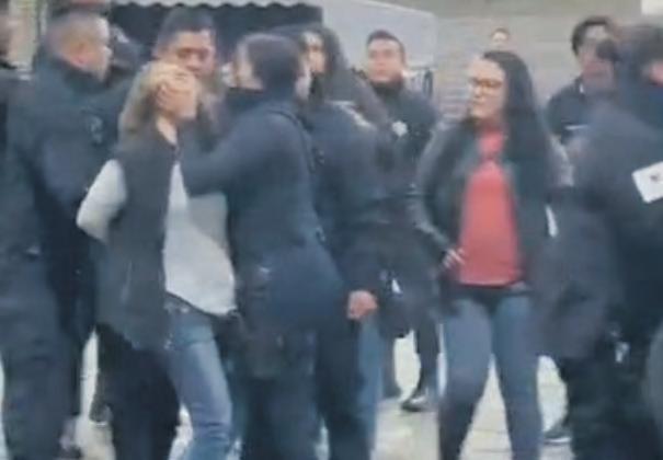 uniformados retienen a una mujer, mientras que una policía la toma de la cara. Con respecto a los hechos, Jorge Sanders Muñoz, presidente de la Asociación de Centros de Esparcimiento Social del Estado de Zacatecas (ACESZ), informó que en el lugar fue detenida la ex presidenta de dicha organización, Laura Torres Huerta; fue liberada más tarde.