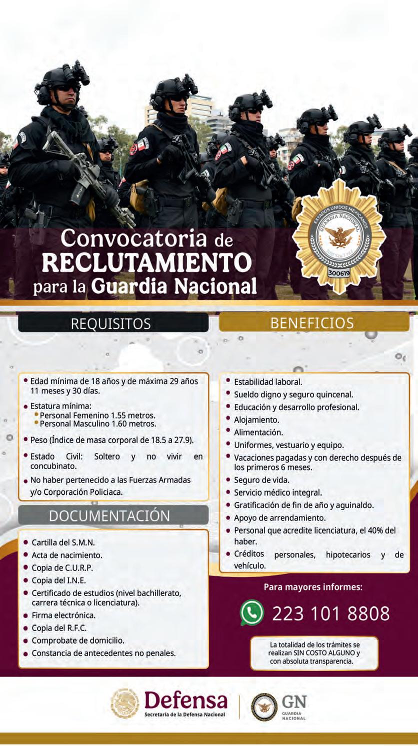 •GUARDIA NACIONAL: AGENTES GUARDIA NACIONAL, ID 20945796, Grado de estudio: Preparatoria, Salario: $ 22000 mensuales.