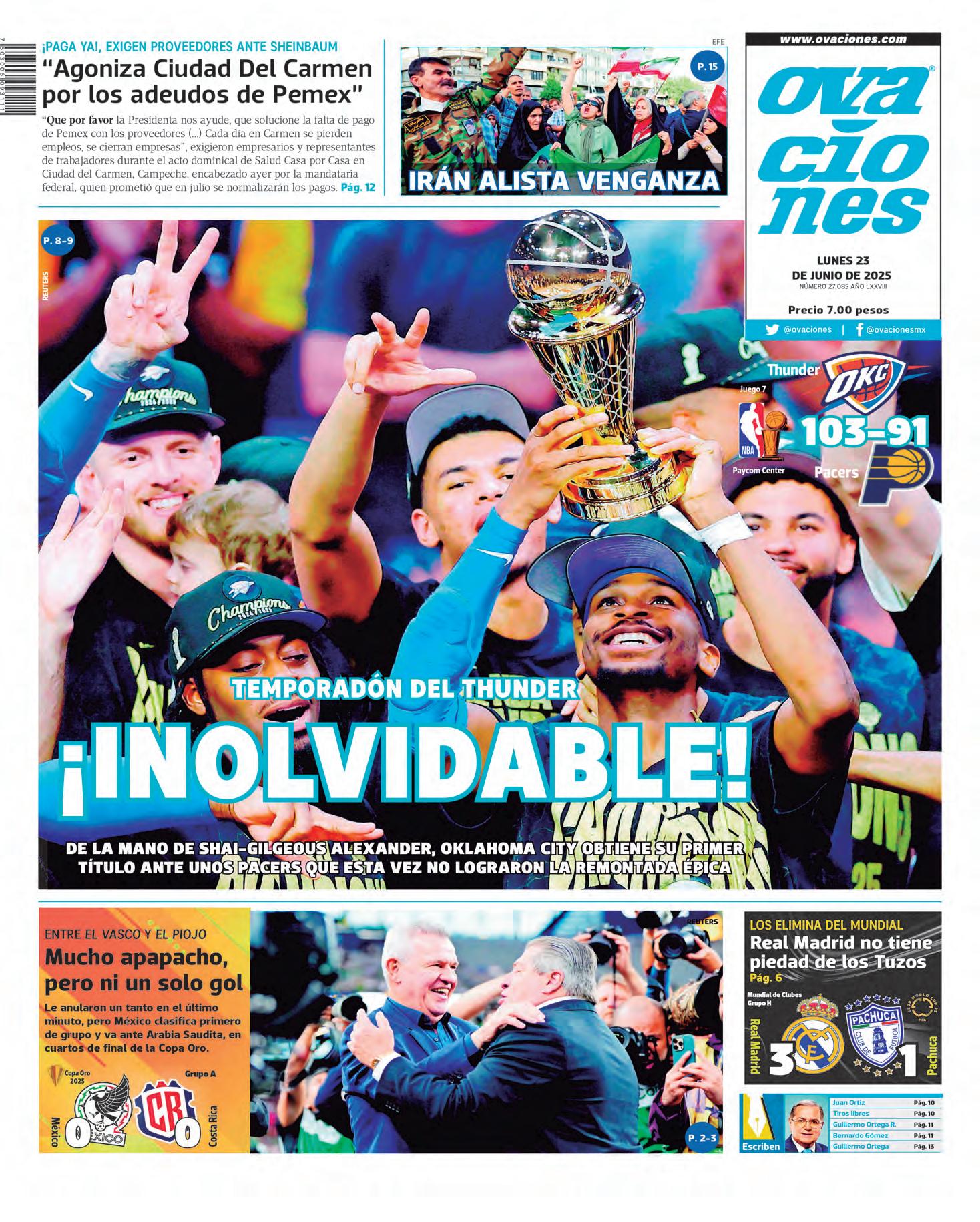 ● DE LA MANO de Shai-Gilgeous Alexander, Oklahoma City obtuvo su primer título de la NBA con marcador de 103 a 91 ante los Pacers, que esta vez no lograron la remontada épica. MARTÍN AVILÉS OVACIONES O8 Y O9
